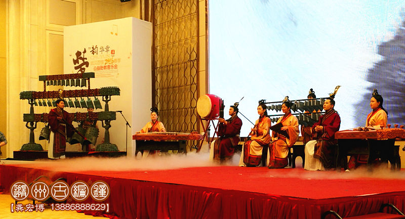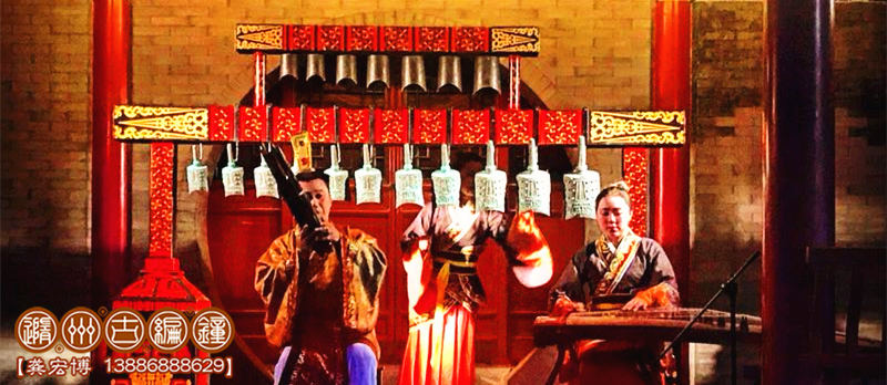 1、小型演出:一般由12-15件編鐘、編磬等配套樂器進行表演,編鐘總長度不超過2.2米,配備1-4名樂師進行演奏,舞臺要求3*3米以上,有伴奏音樂配合演出,適合室內小型宴會、展會等環(huán)境使用。